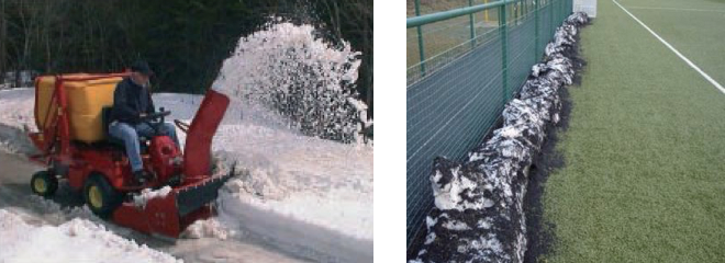 冰雪是無害的,通常情況可以放任其融化。如果一定要移除積雪,則應(yīng)當(dāng)使用專用的人造草坪維護(hù)車推雪或吹雪附件。這樣才能保證對場地的損害減至較小。禁止使用巖鹽和化學(xué)融雪劑,這可能會對草絲纖維造成損傷。