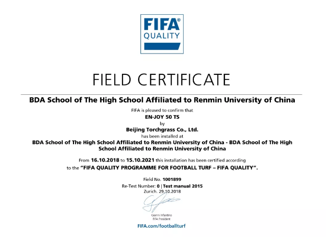 由 北京火炬生地人造草坪有限公司與綠茵天地體育產(chǎn)業(yè)股份有限公司共同打造的, 人大附中經(jīng)濟(jì)技術(shù)開發(fā)區(qū)學(xué)校足球場,于 2018 年 10 月 29 日,通過 FIFA(國際足聯(lián))足球場草坪質(zhì)量檢測,獲得 FIFA Quality 認(rèn)證!