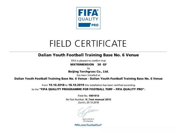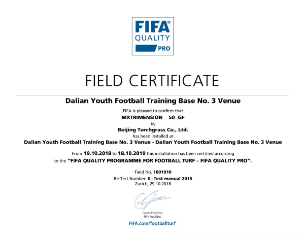 由 北京火炬生地人造草坪有限公司與大連嘉遠(yuǎn)體育工程有限公司共同打造的, 大連市青少年足球訓(xùn)練基地3號(hào)、6號(hào)足球場(chǎng)地,順利通過 FIFA(國際足聯(lián))足球場(chǎng)草坪質(zhì)量檢測(cè),獲得 FIFA Quality Pro 認(rèn)證!