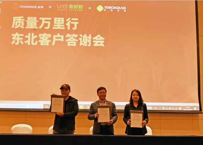 “一句承諾, 一份責(zé)任, 一生堅守,北京火炬生地,只為優(yōu)質(zhì)人造草坪!”會議結(jié)尾,北京火炬總經(jīng)理劉凱楠先生(左)、長河集團(tuán)董事長趙文海先生(中)、廣東恰好時總經(jīng)理常晶晶女士(右),共同以如生命的“品牌”起督,在郭中寶先生和全體客戶的監(jiān)督之下,共同宣讀并簽署承諾書“堅守質(zhì)量,不忘初心,以高質(zhì)量的產(chǎn)品為體育場地建設(shè)提供堅實的后盾和支持”。