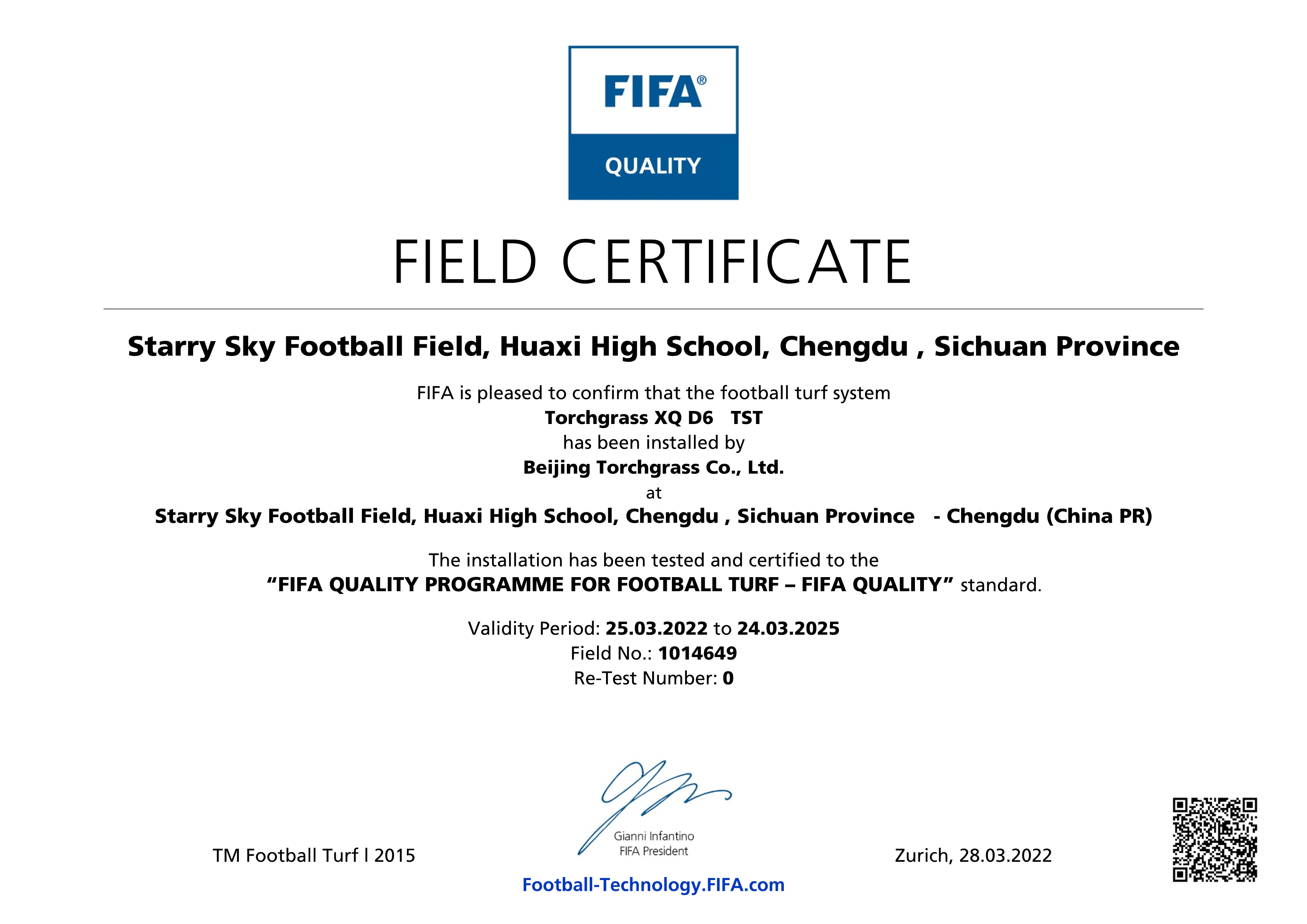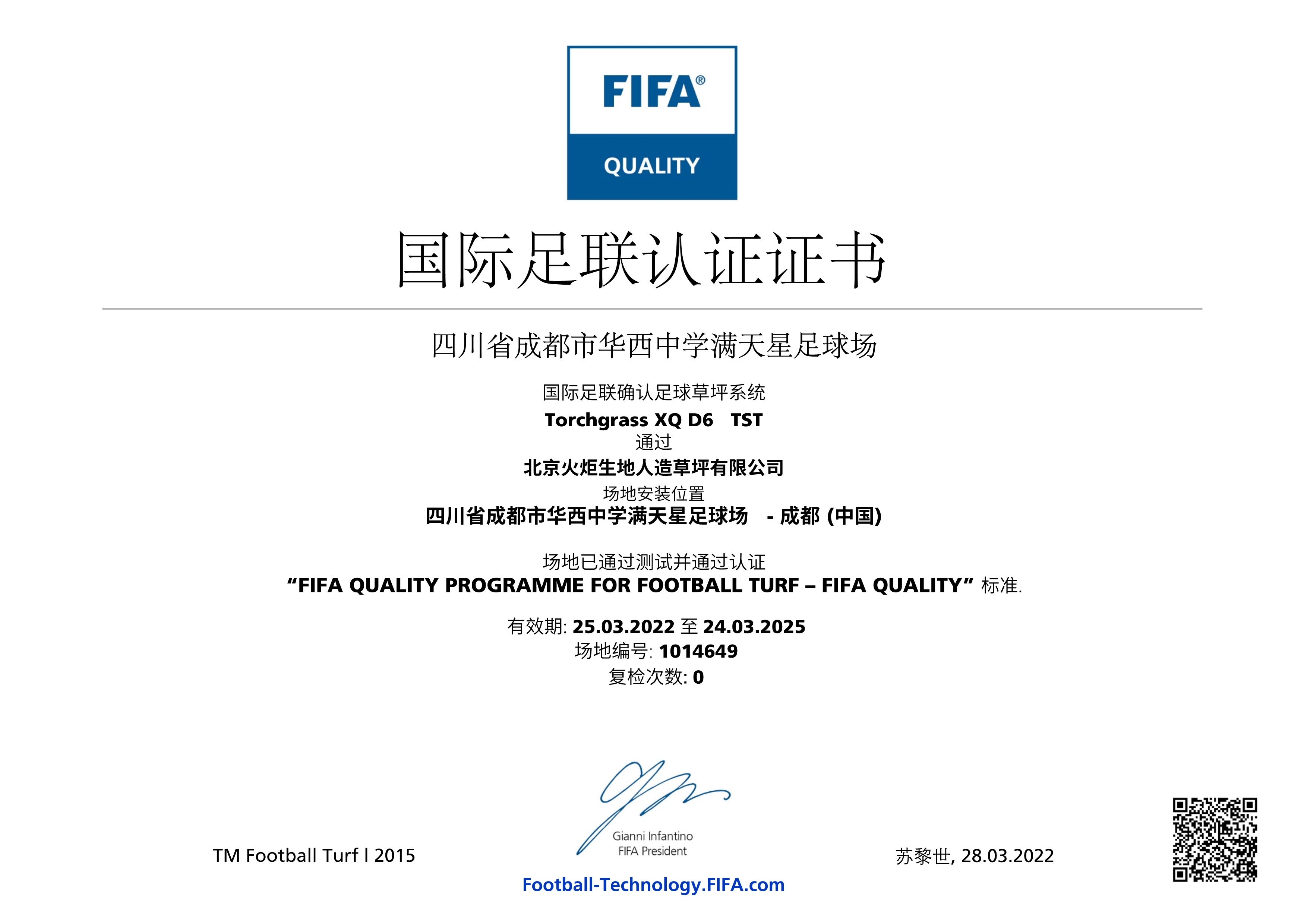 近日,四川省成都市華西中學(xué)滿天星足球場地已通過 FIFA(國際足聯(lián))人造草坪足球場地質(zhì)量檢測,榮獲 FIFA Quality認(rèn)證證書。