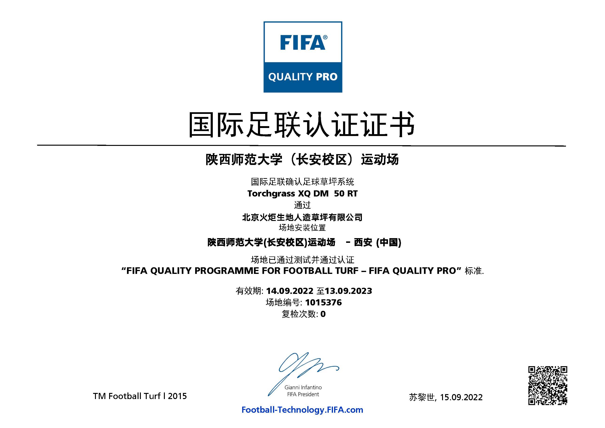 近日,陜西師范大學(xué)(長安校區(qū))運動場地已通過 FIFA(國際足聯(lián))人造草坪足球場地質(zhì)量標(biāo)準(zhǔn)的測試,榮獲 FIFA Quality PRO認(rèn)證證書。