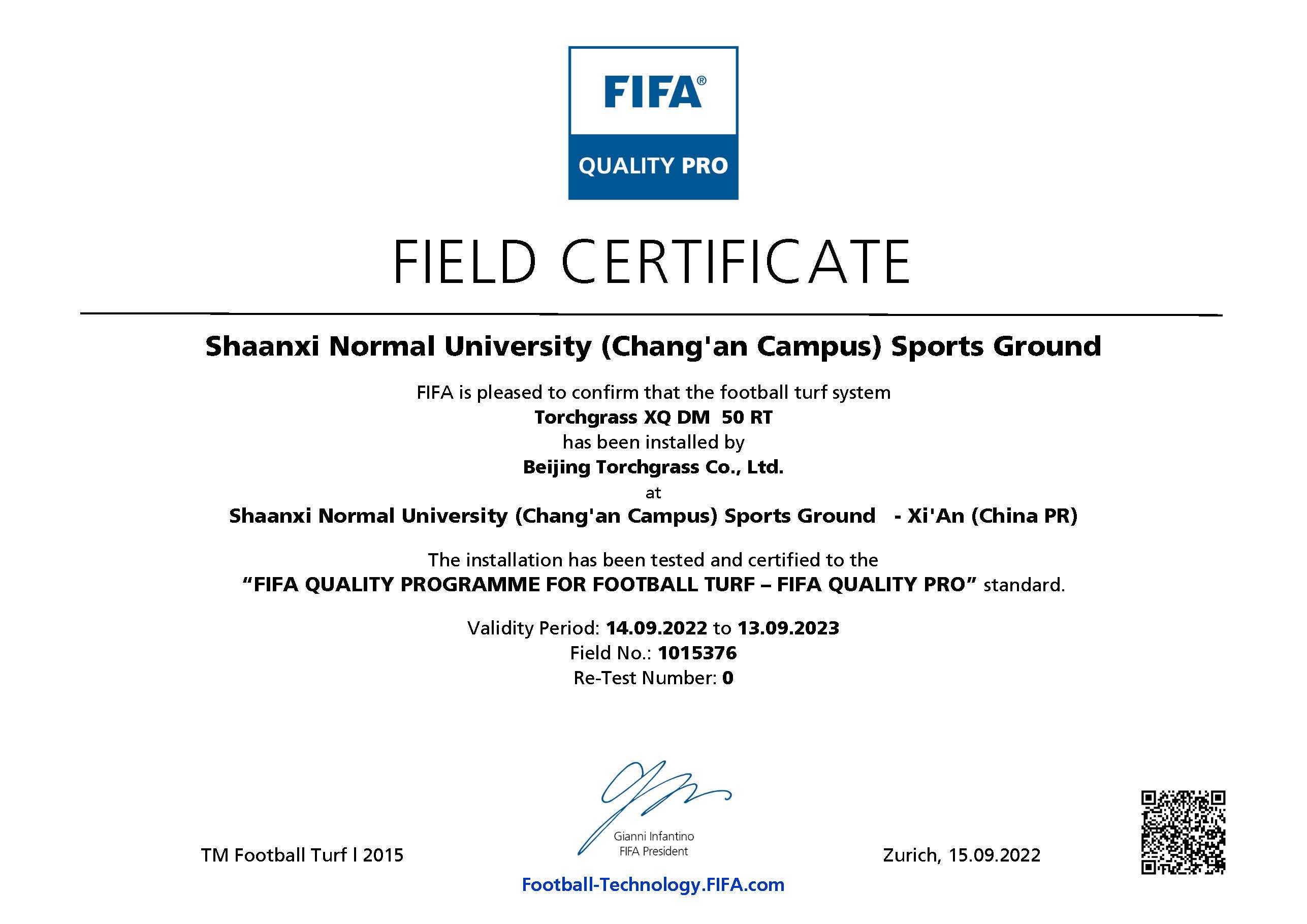 陜西師范大學(xué)(長安校區(qū))足球場嚴(yán)格按照FIFA國際足聯(lián)質(zhì)量標(biāo)準(zhǔn)建設(shè),由北京火炬生地人造草坪有限公司提供的優(yōu)質(zhì)產(chǎn)品,并通過FIFA國際足聯(lián)實驗室現(xiàn)場性能檢測,榮獲FIFA Quality PRO級別認(rèn)證,此級別運動場地可以舉辦亞運會、全運會及各類國際比賽。