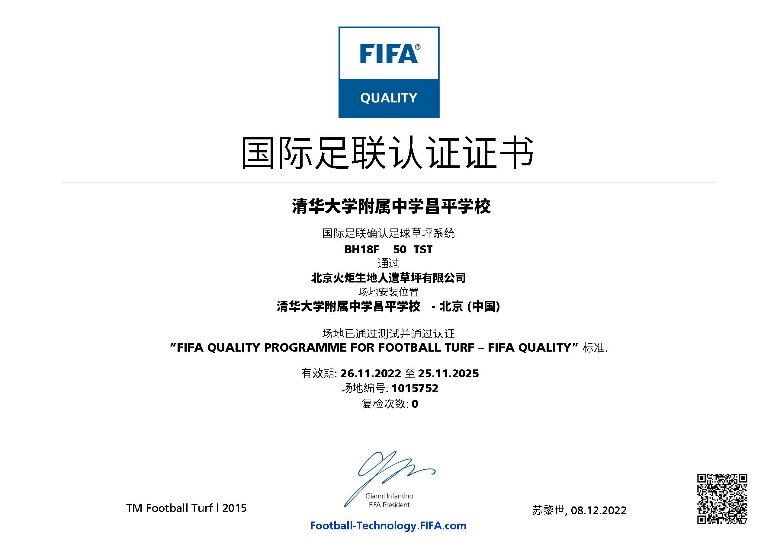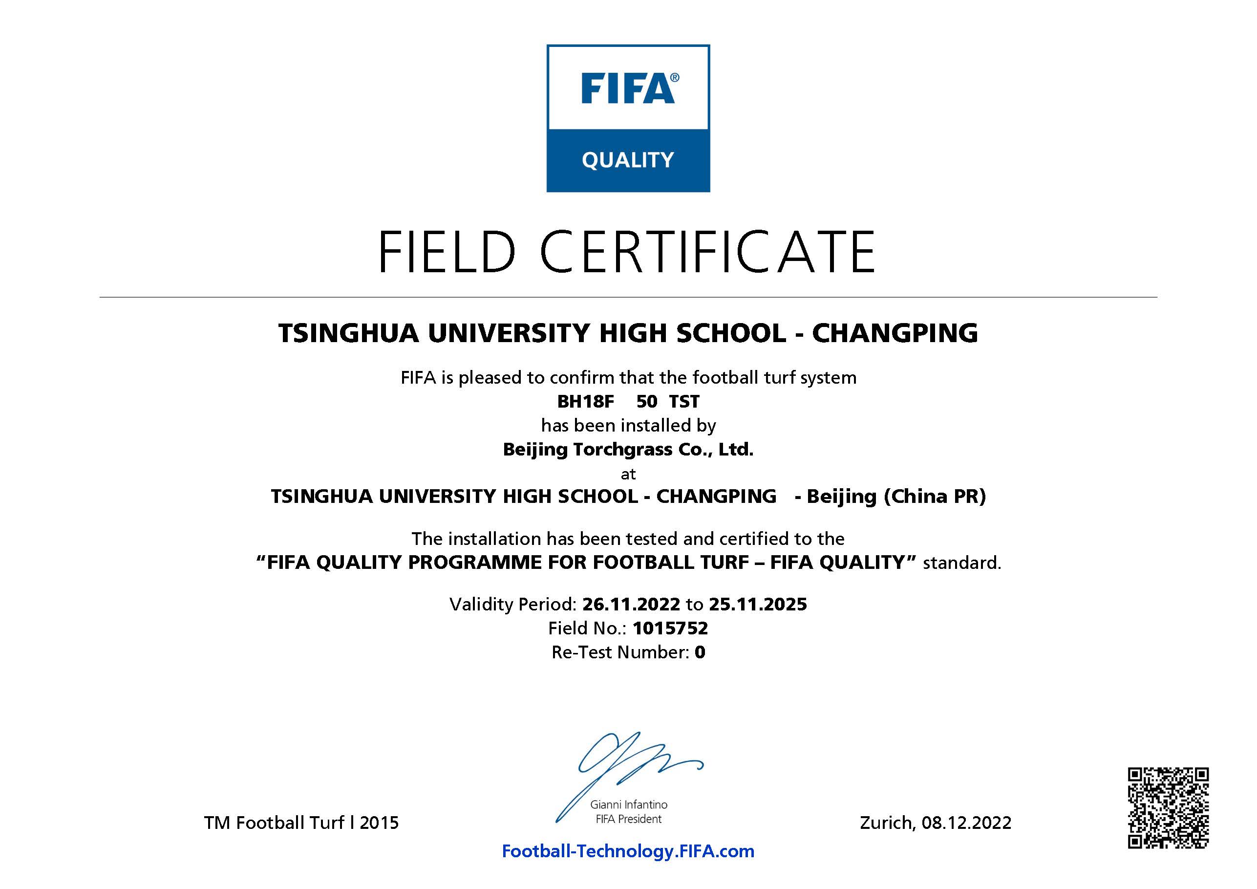 近日,清華大學(xué)附屬中學(xué)昌平學(xué)校足球場(chǎng)已通過(guò) FIFA(國(guó)際足聯(lián))人造草坪足球場(chǎng)地質(zhì)量標(biāo)準(zhǔn)的測(cè)試,榮獲 FIFA Quality 認(rèn)證證書(shū)。