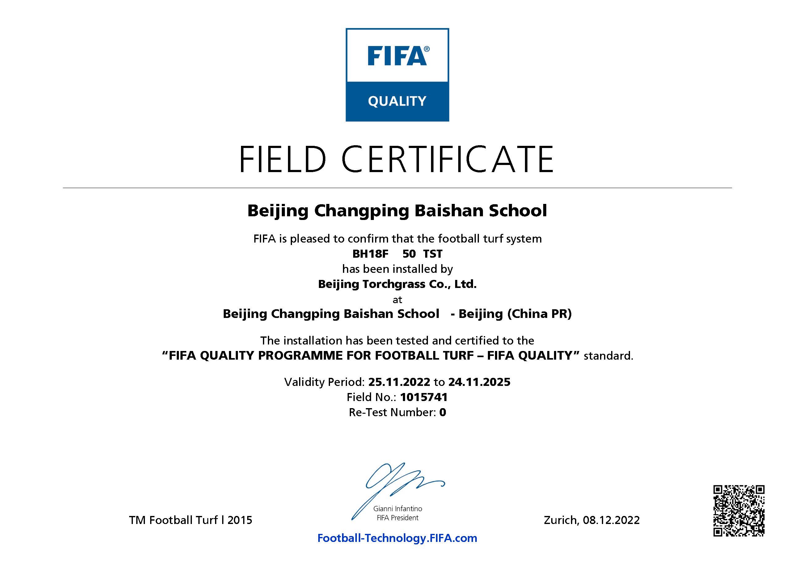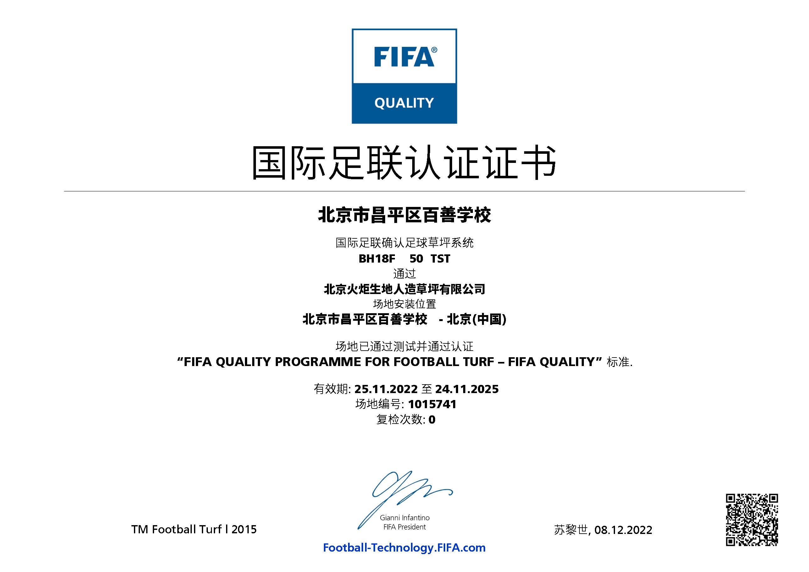 近日,北京市昌平區(qū)百善學校足球場已通過 FIFA(國際足聯(lián))人造草坪足球場地質量標準的測試,榮獲 FIFA Quality 認證證書。